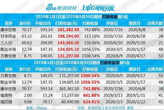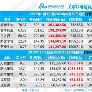 新浪财经上市公司研究院的数据显示,2019年1月1日至2020年6月30日期间,A股共有319家公司IPO。其中,打新收益最高的3只股票分别是康华生物、甘李药业、三人行,收益分别为26.14万元、19.83万元、14.35万元,所对应的收益率分别为742.88%、313.16%、236.66%。