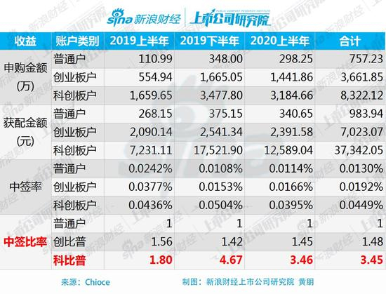 2020年上半年,普通户、创业板户、科创板户的申购总额为298.25万元、1441.86万元、3184.66万元,申购后的获配金额分别为340.65元、2391.58元、12589.04元,所对应的中签率分别为0.0114%、0.0166%、0.0395%。也就是说,普通户每中签100元,创业板户会中签145元,科创板户会中签346元。意味着账户等级越高,中签金额就越高。
