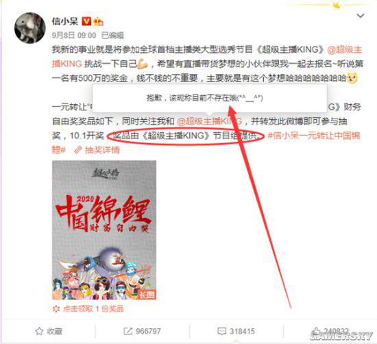 支付宝锦鲤信小呆一元转让“中国锦鲤”活动翻车 奖品提供方微博被封号
