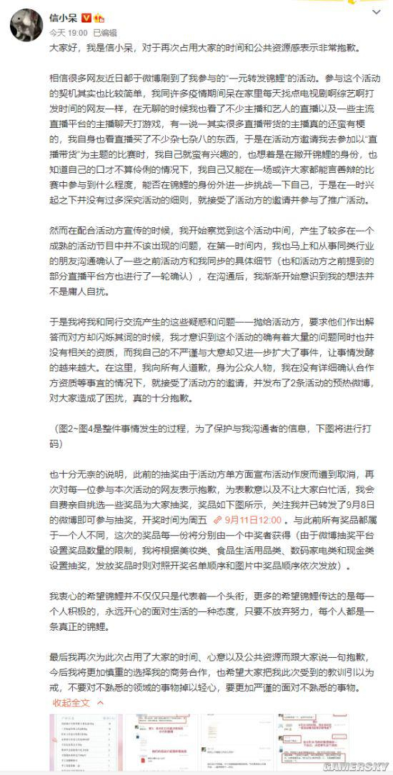 因为这件事,信小呆承诺的500万奖品没有了,为此她在微博道歉,改为自费挑选一些奖品,从500万大奖变成了5万元大奖。