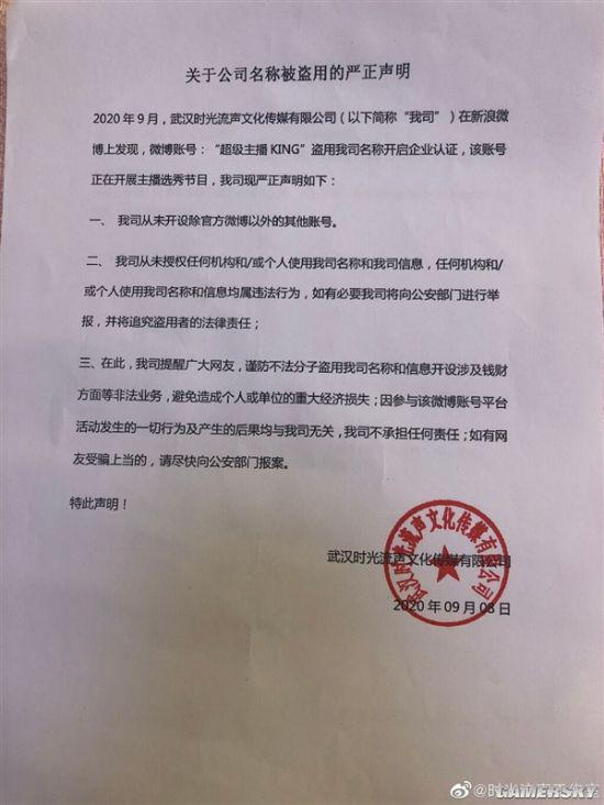 据悉,《超级主播KING》官方微博认证信息是武汉时光流声文化传媒有限公司,与@时光流声工作室的微博认证信息一致。