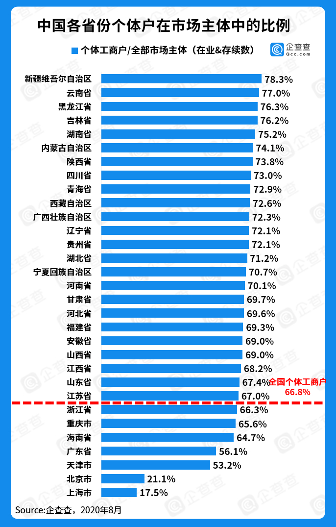 另一方面,个体户数量的绝对值不能与个体户的活跃度画等号。以广东省为例,虽然个体户数量排名第一,但其TGI小于100,说明广东的个体户并不十分活跃。个体工商户占比数据更为直接地验证了这一点,企查查数据显示,截至2020年8月,广东省个体户占比56.1%,而全国个体户占比66.8%,广东省个体户占比低于全国水平,也即广东省的其他市场主体(国企、外企、民企等)更为活跃。