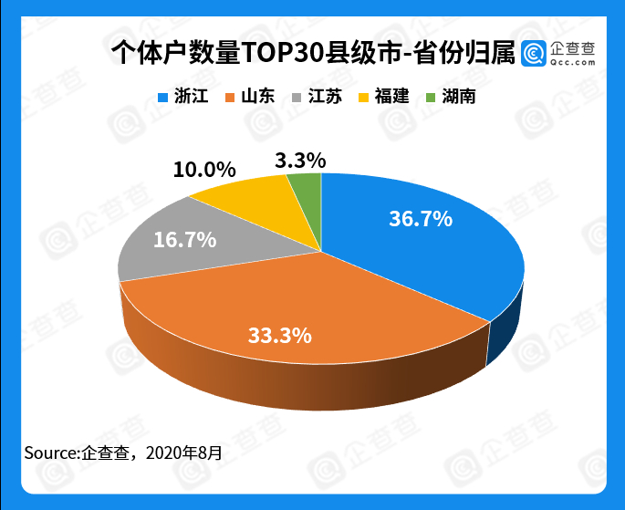 我们还发现,这些个体经济发达的县级区域大多分布于浙江、山东和江苏,以及福建和湖南,这与省份排名亦有所对应。浙江省个体经济十分发达,所辖县区在TOP30县区中既排名靠前,又数量最多;山东省所辖县区排名虽不靠前,但胜在数量多;江苏省以昆山为首,数量虽不敌浙江、山东,但稳居榜首,此三省个体经济最为强势。至于福建和湖南,也有南安市、宁乡市、石狮市、龙海市这些个体经济发达的县区。