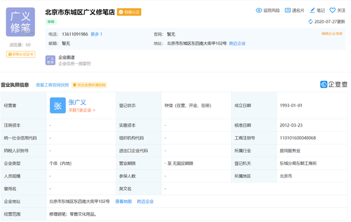 张广义,正是这家专修钢笔的小店——广义修笔店的店主。这家店每天只开业一个半小时,经常有游客慕名而来参观和拍照,其存在的意义已经超过了使用的意义。企查查APP显示,“广义修笔店”成立于1993年,至今已有27年。据公开采访报道,早在上世纪50年代,张广义就在东安市场修笔,老先生的修笔职业生涯约有70年。