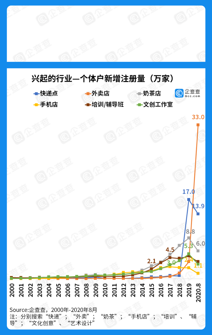 企查查数据显示,过去20年间,快递相关个体户年注册量已从最初的162家发展到如今的十万多家,奶茶相关个体户从514家发展到6万多家,手机店则是从178家上升到1万多家,培训/辅导班相关个体户如今年增量已达4万多家,此外文创工作室相关个体户数量也从年新增696家到5万多家。