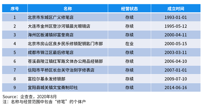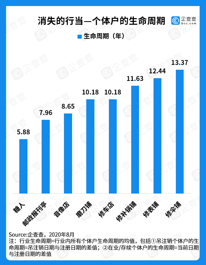 企查查挑选了一些类似于修笔铺的行当,研究这些“消失的老行当”的生命周期。数据显示,这些行当里的个体户生命周期基本在10年左右。但生命周期并不代表从业时长,其实很多个体户的从业生涯早从青年时期就开始了,从学徒做起,最后成为技艺熟练的手艺人,干一行,就是干一辈子。
