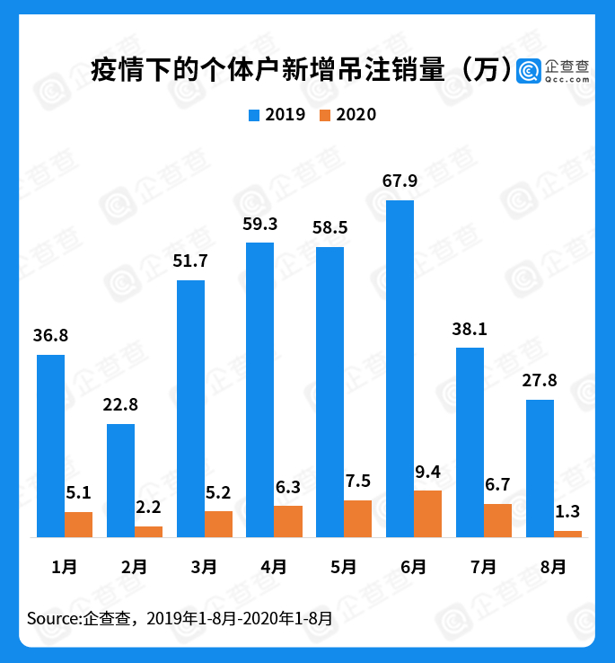 疫情下的吊注销数据却是另一番景象。企查查数据显示,2020年1-8月,我国个体户吊注销总量43.9万家,而2019年1-8月,我国个体户吊注销达到362.8万家,今年数据同比下降了87.9%。对于这个数据,我们要审慎分析,一方面,由于疫情的不可抗力,有些个体户尽管已经停歇业,却未能及时履行完注销手续办理;另一方面,即使上半年业绩不佳,大部分个体户也期待能够熬过疫情的短期影响,并不会优先选择注销。