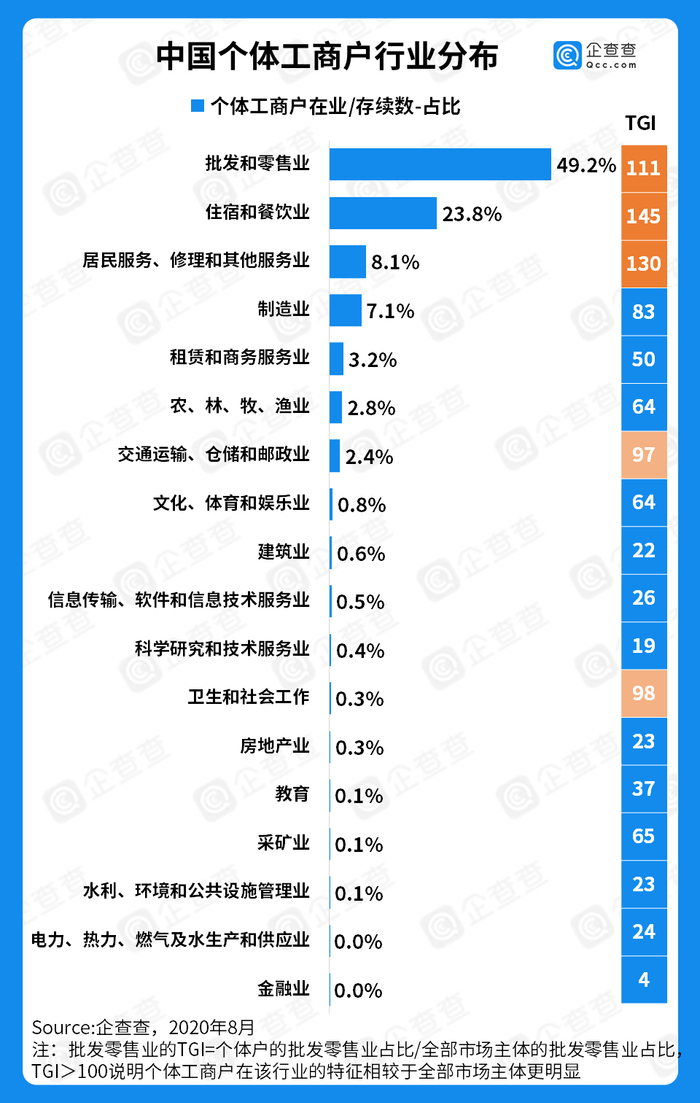 不难发现,个体户数量分布最多的行业都与居民生活服务相关,由于个体工商户规模较小、经营灵活、适应面广,他们天然与服务业的需求十分匹配。企查查数据显示,“批发零售业”、“住宿餐饮业”以及“居民服务、修理和其他服务业”是个体工商户分布最多的行业,并且这三大行业的TGI远远大于100,表明其个体户相较于其他行业更为活跃。