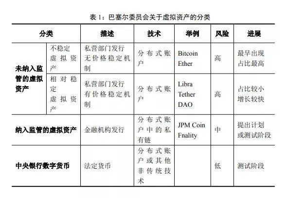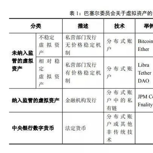 虚拟资产的种类繁多,为了厘清监管思路、明确监管重点,巴塞尔委员会根据发行主体和机制设计的不同,将现有的虚拟资产分为三类:未纳入监管的虚拟资产、纳入监管的虚拟资产和央行发行的数字货币(表 1),前两类也曾被称为“私人数字货币”。