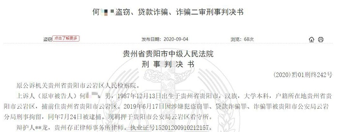 贵州省贵阳市中级人民法院刑事判决书((2020)黔01刑终242号)贵州省贵阳市云岩区人民法院审理贵州省贵阳市云岩区人民检察院指控被告人何某平犯盗窃罪、贷款诈骗罪、诈骗罪一案,于2020年4月3日作出(2020)黔0103刑初42号刑事判决。宣判后,原审被告人何某平不服,向贵州省贵阳市中级人民法院提出上诉。