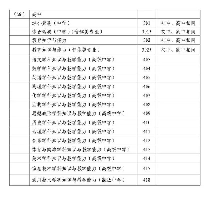 1、根据教育部《关于中小学教师资格考试音、体、美专业考生公共科目单独编码的通知》(教师司函〔2017〕34号)文件要求。从2017年下半年考试开始,对音、体、美专业考生的笔试公共科目一、科目二(科目代码:201、202、301、302)实行单独编码(相应科目代码:201A、202A、301A、302A)。实行单独编码后,音、体、美专业考生在笔试报名时应选报单独编码的公共科目。取得科目201A、202A合格的考生,面试仅限于参加小学类别音、体、美专业科目;取得科目301A、302A合格的考生,面试仅限于参加初中、高中、中职类别音、体、美专业科目。考生获得科目201、202、301、302的合格成绩,可相应替代科目201A、202A、301A、302A的合格成绩;考生获得201A、202A、301A、302A的合格成绩不可替代科目201、202、301、302的合格成绩。