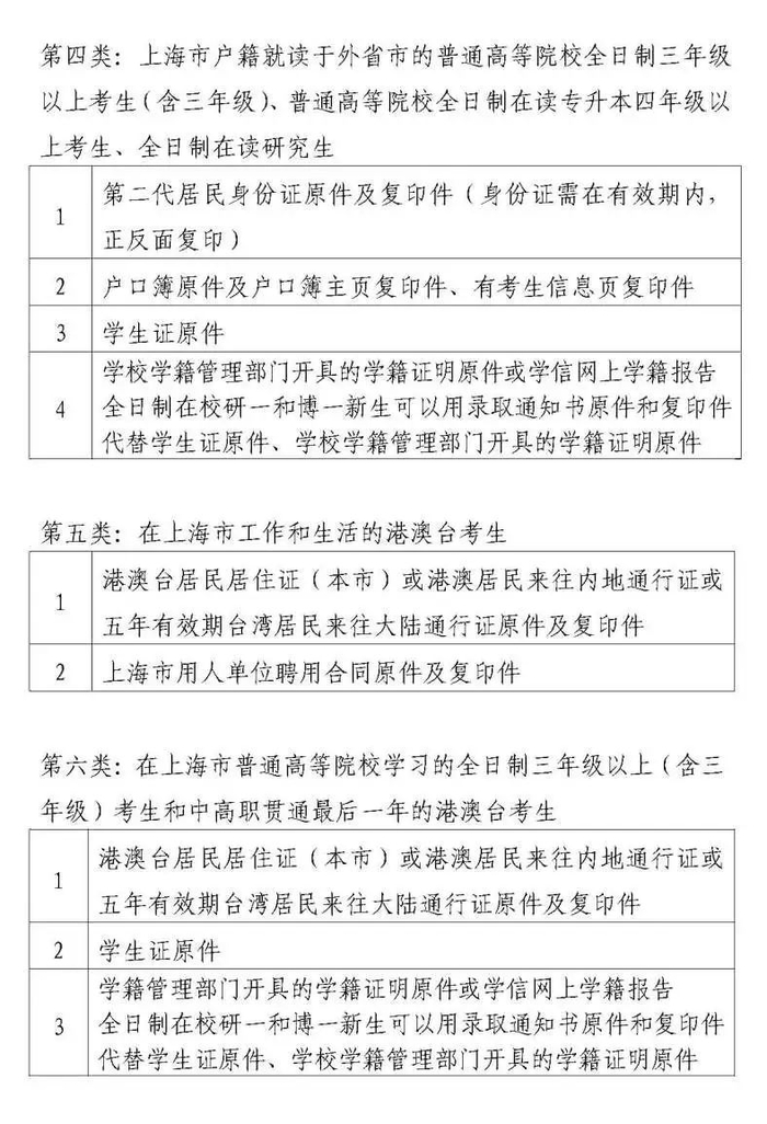 (五)上海市普通高等院校以及户籍在上海的外地普通高等院校全日制三年级以上考生(含三年级)、中高职贯通考生允许在其学习的最后一年,凭学校学籍管理部门出具的在籍学习证明报考。