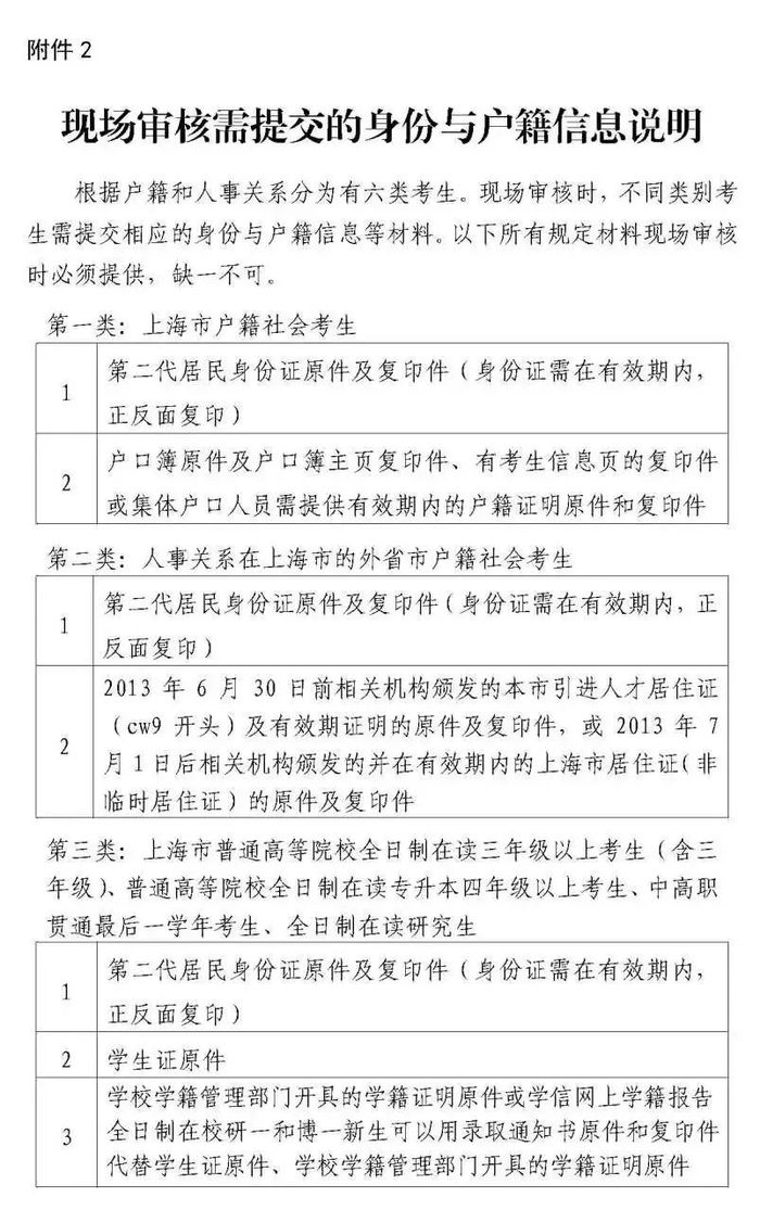 申请幼儿园、小学、初级中学、高级中学、中等职业学校教师资格和中等职业学校实习指导教师资格的本市户籍或人事关系在上海市的外省市户籍的居民、在本市学习、工作和生活的港澳台居民。现场审核需提交的身份与户籍信息说明,如下: