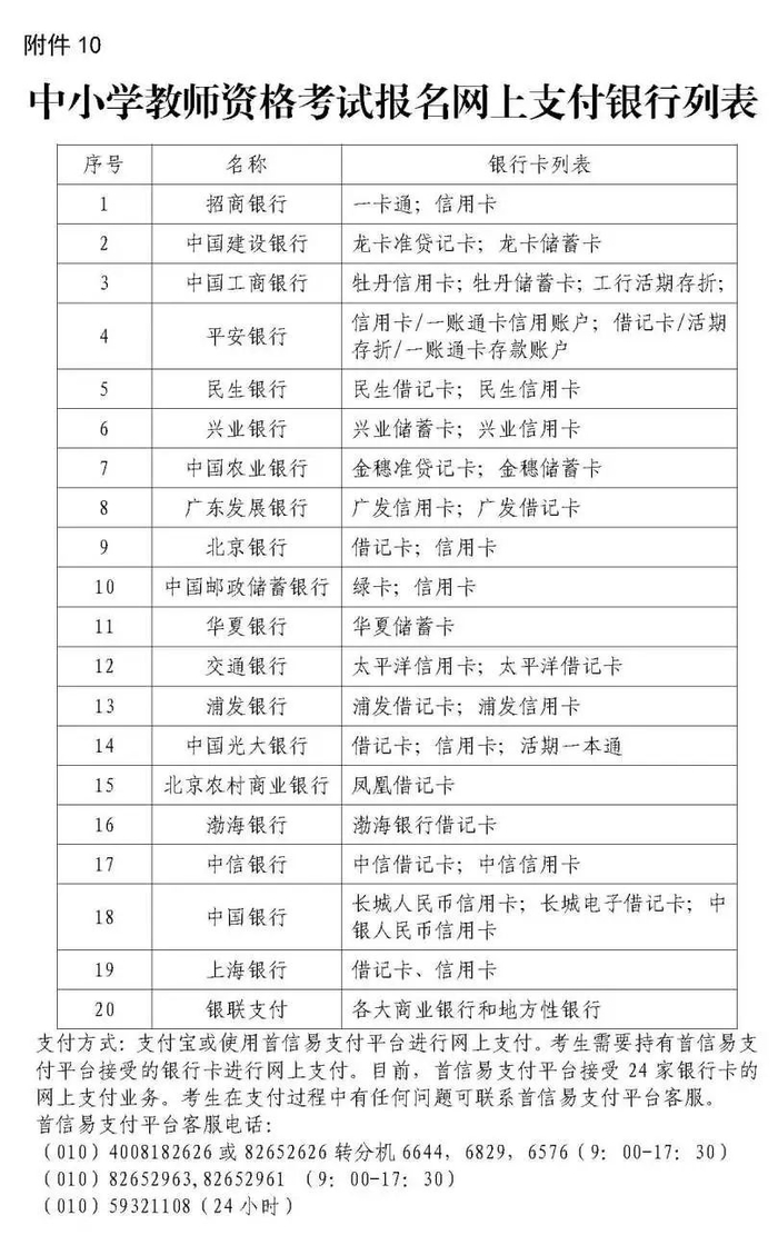2、支付方式:考试缴费全部采用网上支付方式,不再接受现场缴费。网上在线支付操作流程见附件9:中小学教师资格考试网上支付流程。考生在支付过程中有任何问题可联系首信易支付平台客服,详见: