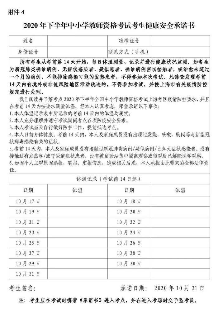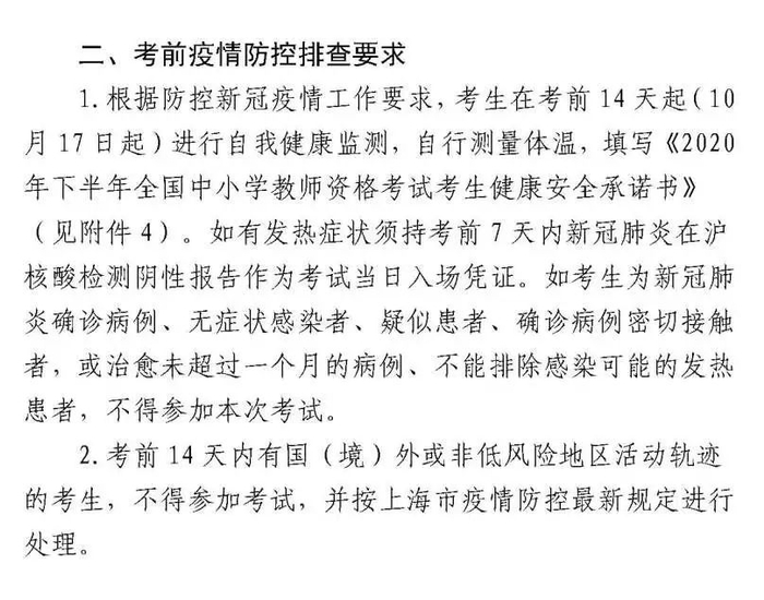 (八)考前防控疫情排查要求。请考生自觉对照《上海市中小学教师资格考试笔试有关疫情防控要求》中的考前防控疫情排查要求进行自我排查,并填写《2020年下半年中小学教师资格考试考生健康安全承诺书》。不具备考试条件的考生不得参加本次考试。如下: