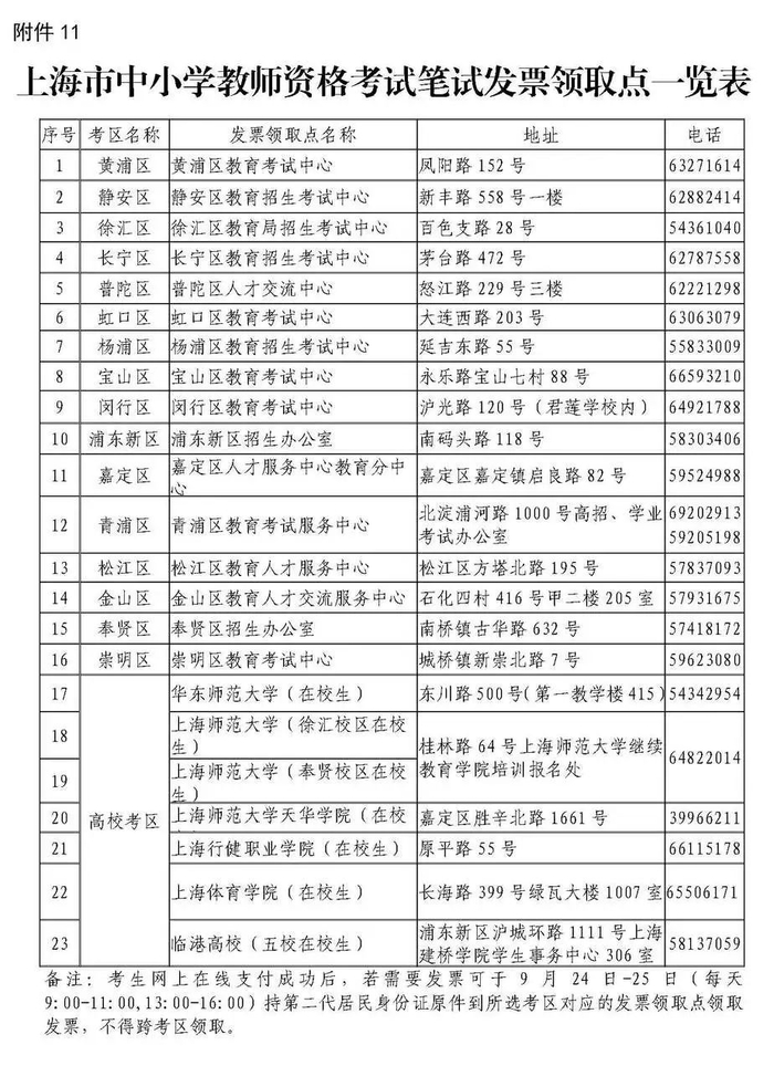 4、考生网上支付成功后,若需要发票可于9月24日(星期四)—9月25日(星期五)(每天9:00-11:00,13:00-16:00)持第二代居民身份证原件到报名考区领取发票,(发票领取点详见:上海市中小学教师资格考试笔试发票领取点一览表),不得跨考区领取。
