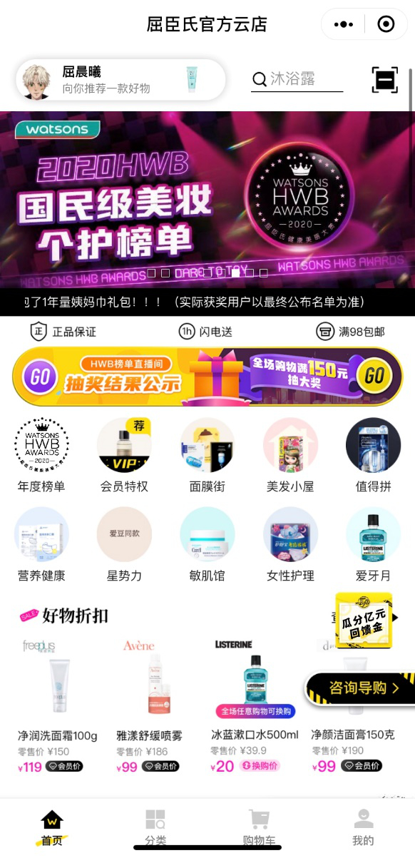 可以说,屈臣氏希望用屈晨曦搭建与消费者的对话框。透过屈晨曦,屈臣氏可以用更灵活的方式,完成屈臣氏社交媒体、屈臣氏云店、屈臣氏造美星球、屈臣氏值得拼、屈臣氏种草社,以及新上线的屈臣氏撸猫小程序等多个触点与消费者之间的互动。其中,作为屈臣氏今年重点推出的官方云店,则集聚了今年的“流量爆款”设置,包括首页设置人气明星直播、屈臣氏独家品牌、万人团、网红博主测试榜单等栏目。