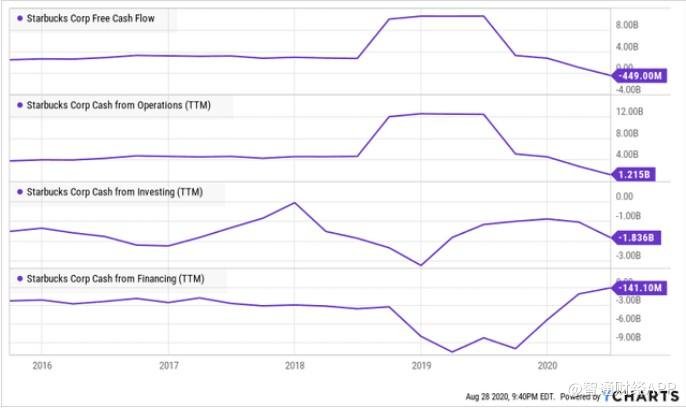 在过去的12个月里,星巴克的自由现金流为-4.5亿美元,营运现金急剧下降。