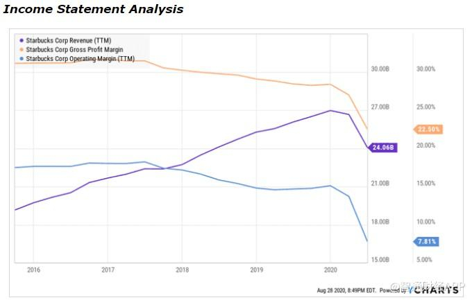 首先从损益表开始。在2020财年,星巴克的营收和利润急剧收缩。