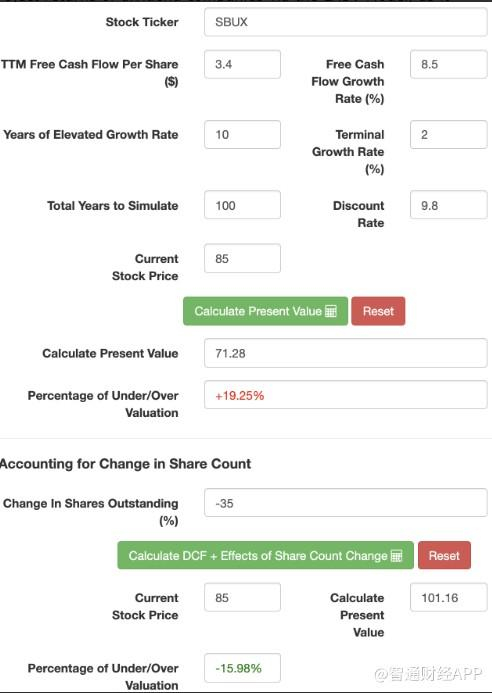 Stevens采用专有的估值模型来计算星巴克的内在价值。该模型的要点如下: