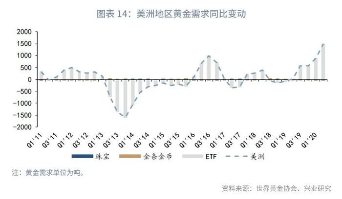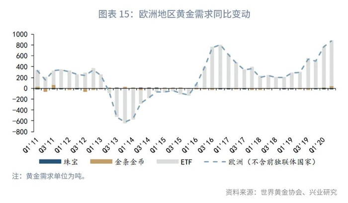 地区对比更为鲜明的是黄金ETF的投资需求。2020年第一季度亚太地区(不含日本、中国香港地区、中国台湾地区)黄金ETF投资需求增长41.48吨,第二季度增长68.58吨。而同期欧美黄金ETF投资需求同比分别增长了1619.6吨和2314.9吨(详见图表13至图表15)。