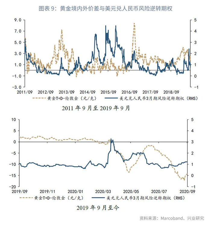 我们采用2011年至今黄金境内外价差作为因变量,美元兑人民币3月期风险逆转期权以及伦敦金作为自变量,进行多元线性回归。结果显示,多元线性回归结果的R2为0.44,其中伦敦金的解释权重为美元兑人民币风险逆转期权的2倍。