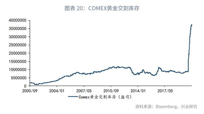 供给下降和运输受限也是造成第二季度境内黄金大幅折价的重要因素。2020年第二季度,全球黄金产量同比下降67吨,与之相比影响更大的是3、4月份因为新冠疫情导致的全球航空运输的暂停(详见图表17)。从全球黄金产地来看,亚太地区为全球主要黄金产地(详见图表18),而全球70%的黄金加工都是由瑞士四家大型精炼厂完成。3月份,瑞士三大黄金精炼厂Valcambi、PAMP及Argor–Heraeus受新冠疫情影响暂时停止生产,加之航空禁运使得黄金无法运送至美国COMEX黄金交割库,致使黄金出现短缺,黄金市场EFP[2]报价在3、4月份出现大幅飙升(详见图表19)。而在此后,因为Comex此前溢价过大,大量有交割资格的参与者将黄金实货运往Comex交割库,造成Comex黄金库存飙升(详见图表20)。从EFP报价来看,8月以来黄金境内外价差的扩大与供给端的关联不大。而虽然黄金ETF投资需求在第三季度依然旺盛,但随着中印需求自第二季度底部回升,发达市场和新兴市场黄金需求的缺口应有所缩小(尚未有分区域数据佐证)。所以2020年8月黄金境内折价的再度扩大并创出新低,供需端的影响相较3、4月份时减弱。需注意黄金境内外价差是否在2020年后进入新的波动区间。