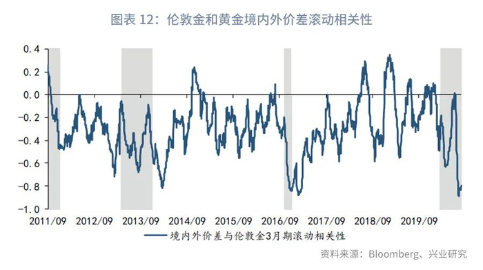 2011年至今,黄金境内外价差与伦敦金整体呈现出负向同步性(详见图表11)。滚动相关性结果显示,两者负相关性基本稳定,负相关性阶段性可以高达-0.9。而且黄金境内外价差偏离正负2个标准差集中出现的时段中,其与伦敦金的负相关性均持续增强(详见图表12)。