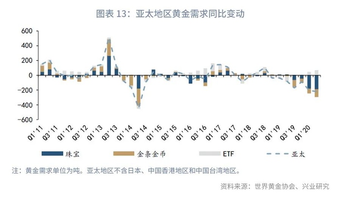 珠宝和零售需求(金条&金币)是黄金最大的需求构成,黄金实物需求最大的需求国是中国和印度。而欧美国家则是黄金ETF投资需求的主力军。2020年第一季度亚太地区(不含日本、中国香港地区、中国台湾地区)珠宝需求同比下滑185.9吨,第二季度这一数据为同比下降191.6吨,同期美欧珠宝需求虽有下滑,但下滑量仅分别为4吨和19.8吨。零售需求方面,2020年第一季度亚太地区(不含日本、中国香港地区、中国台湾地区)金条金币需求同比下滑59.03吨,第二季度同比下滑99.57吨,而同期美欧金条金币需求分别增长了33.8吨和52.6吨。