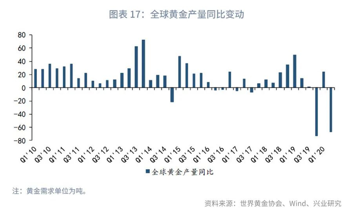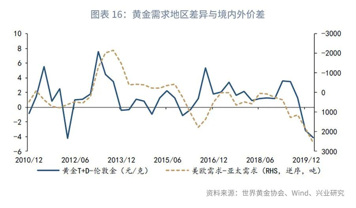 三类需求合计,2020年第一季度亚太地区(不含日本、中国香港地区、中国台湾地区)黄金需求下滑203.41吨,第二季度下滑222.54吨,而同期欧美黄金需求分别增长1648.73吨和2347.66吨。历史来看,发达市场与新兴市场季度黄金需求同比变动与当季黄金境内外价差存在较为明显的反向性(详见图表16)。