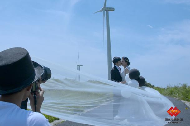 图为一对新人正在以该公司的美丽风电场为背景拍摄婚纱照