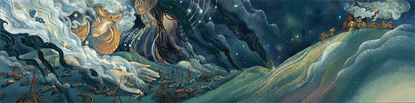 在我之前,有很多关于木兰从军的故事绘本,有很多是我敬重的前辈老师创作的。在创作之初,我思考最多的,就是该从什么角度去描绘木兰。木兰从军,看似一个宏大的题材,但其中又渗透着一个少女的真实生活与一个淳朴高尚灵魂的成长心路,她乡村老家的木屋、父亲教她的骑射技术、军旅生活的孤单与乡愁、大战之前的紧绷与迷茫、凯旋之后的不计功名、获得一群战友的拥戴回乡。我相信,再宏大的题材,其最动人之处一定藏在生活感受本身。