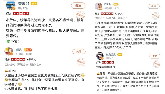 之所以被贴上“海底捞”的标签,是不少顾客在用餐之后评价称“小放牛的服务堪比海底捞”“甚至比海底捞还要好”。