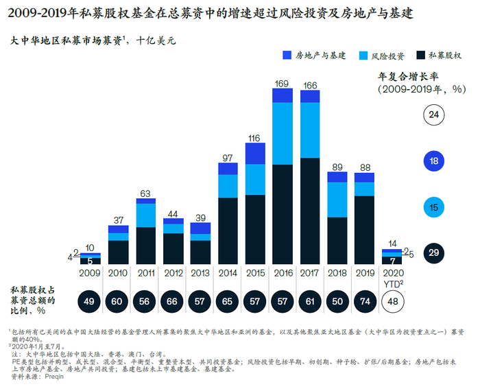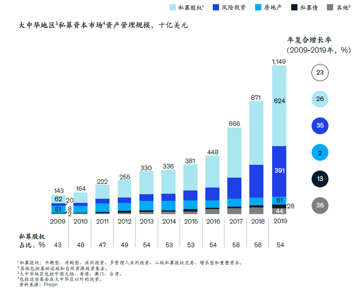 数据显示,在2009年到2019年间,在中国经营的PE公司募资的年复合增长率为29%,增速领跑所有主要资产类别。