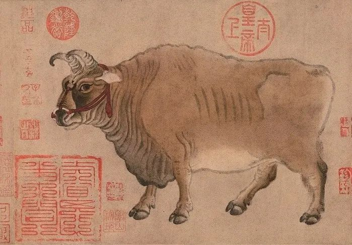 四是藏家牛。珍宝必遇识宝人。喜爱并收藏《五牛图》的也都是赫赫有名的人物:北宋徽宗将此宝收藏内府,视若珍宝;靖康之变珍宝劫后余生,南渡为宋高宗所得,高宗在画上钤其“睿思东阁”“绍兴”印章,以显珍视;此后,元代知名书画家赵孟頫、元太子、明代大收藏家项元汴等著名文化大师都收藏过此画;到了清朝,乾隆帝更是将其收藏在紫禁城和中南海春耦斋,不时观赏、爱不释手。