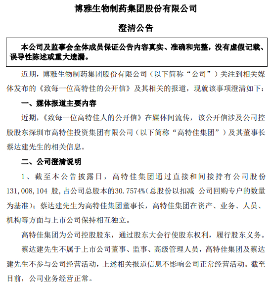 对此,高特佳集团方面对第一财经表示,《公开信》涉及董事长家庭私事,公司对此不便回应;信中涉及公司内部管理问题,公司已经成立调查组正在核实,待确认后再做回应。博雅生物回应:高特佳集团及蔡达建不参与公司经营活动