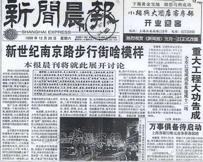 1999年9月20日,南京路(河南中路至西藏中路段)建成全天候步行街。南京路步行街一期工程全长1033米,路幅宽18~28米。人们发现,建成后的步行街上有太多新奇的东西,是当时上海人前所未见的——贯穿整条步行街的“金带”设计就是其中之一。