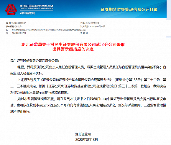 湖北证监局认为,民生证券武汉分公司的行为违反了《证券公司和证券投资基金管理公司合规管理办法》(证监会令第133号)第二十二条、第二十三条相关规定。根据《证券公司和证券投资基金管理公司合规管理办法》第三十二条第一款规定,湖北证监局决定对民生证券武汉分公司采取出具警示函的行政监管措施。