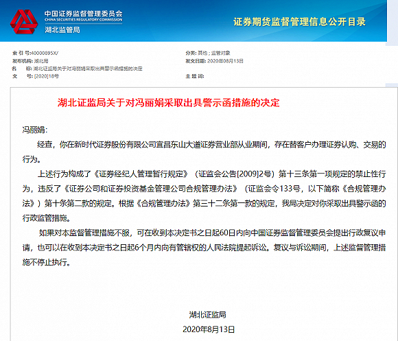 湖北证监局指出,冯丽娟的行为构成了《证券经纪人管理暂行规定》(证监会公告[2009]2号)第十三条第一项规定的禁止性行为,违反了《证券公司和证券投资基金管理公司合规管理办法》(证监会令133号,以下简称《合规管理办法》)第十条第二款的规定。根据《合规管理办法》第三十二条第一款的规定,湖北证监局决定对冯丽娟采取出具警示函的行政监管措施。