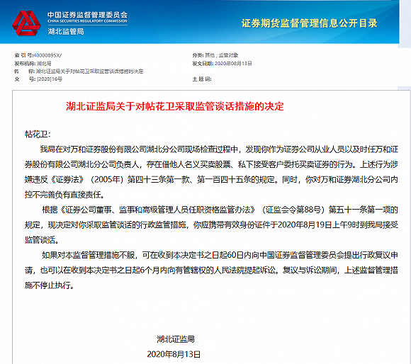 根据《证券公司董事、监事和高级管理人员任职资格监管办法》(证监会令第88号)第五十一条第一项的规定,湖北证监局决定对贴花卫采取监管谈话的行政监管措施,责令其携带有效身份证件于2020年8月19日上午9时到证监局接受监管谈话。