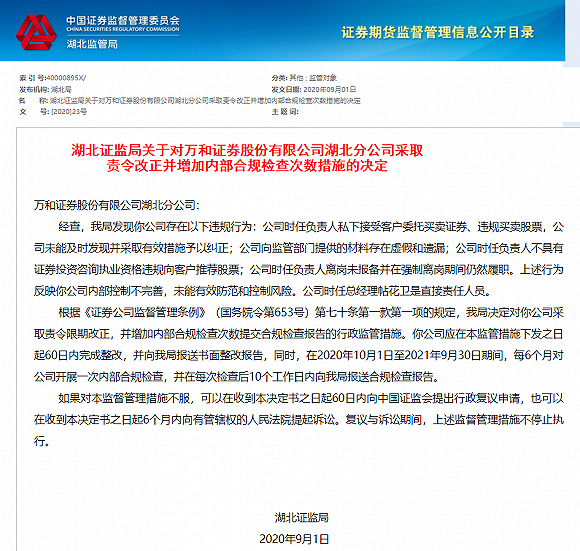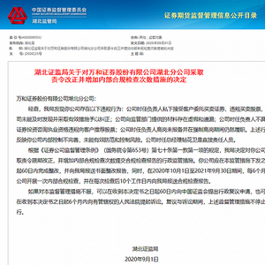 9月11日,湖北证监局对3家券商分支机构开出4张罚单。万和证券、新时代证券、民生证券等3家券商湖北地区分支机构因内控、合规等问题遭到湖北证监局处罚。其中,万和证券湖北分公司时任负责人还将到湖北证监局接受监管谈话。