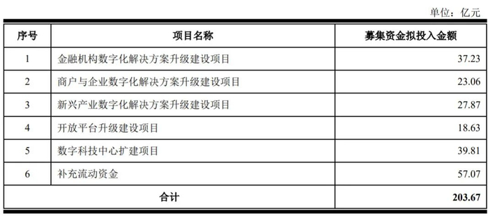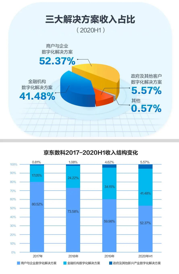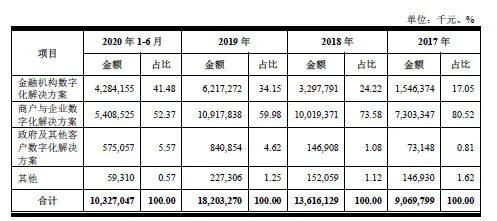另据招股书显示,2020年1-6月,金融机构数字化解决方案和商户与企业数字化解决方案,分别占营收比为41.48%和52.37%,这两个解决方案还持续稳定增长。以金融机构数字化解决方案为例,该业务在报告期各期收入分别为15.46亿元、32.98亿元、62.17亿元和42.84亿元,年复合增长率达到100.51%。