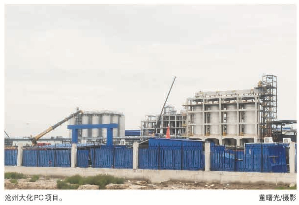记者在沧州渤海新区临港经济技术开发区采访了解到,沧州大化年产10万吨的PC项目,目前主体已经建成,办公区还未装修完成,控制中心尚在布线,设备尚未进入调试阶段。多位现场施工人员表示,按照项目建设进度,很难在10月份建成投产。