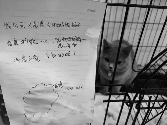 没想到,绝育之后,它依旧在尿床。医生给的解释是:心理原因,缺少关爱,而且只能多陪伴,没有更好的办法。当时我下定决心要对他进行性格改造,于是斥巨资在网上购入一个大铁笼。每次尿床,就会被我关进去半天,并在保证书上压上它的猫爪。结果,由于十万加性格过于刚烈,一天下班之后,我发现它自己把笼子拆掉逃了出来,并把家里能打翻的东西都打翻了。