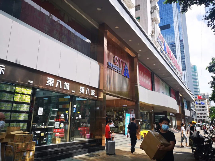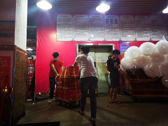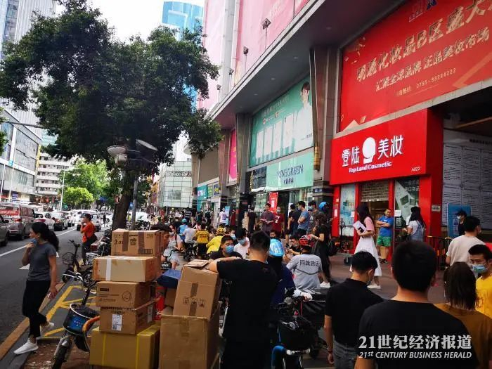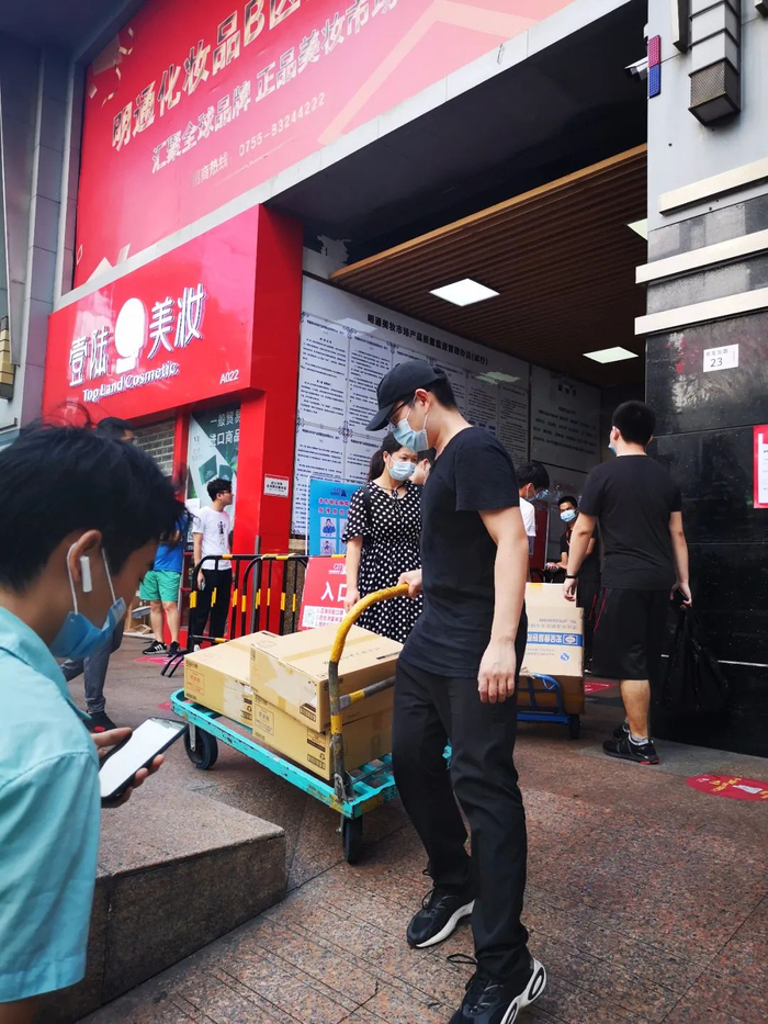 明通与华联发大厦之间是条无名小巷,汽车、摩托车、堆满货的小推车和行色匆匆的路人挤成一团。化妆品市场西门入口斜坡上,两个趿着夹脚拖鞋的黑衣男子,正费力将一板车的纸箱和塑料泡膜推到门口,狭小的梯道不断有人从他们身边侧身穿过,外卖小哥拎着一摞快餐盒跑着,嘴里大叫“让一让,让一让……”从里面出来一位姑娘差点与小哥撞了个满怀,因为她拖着行李箱闪躲不及。