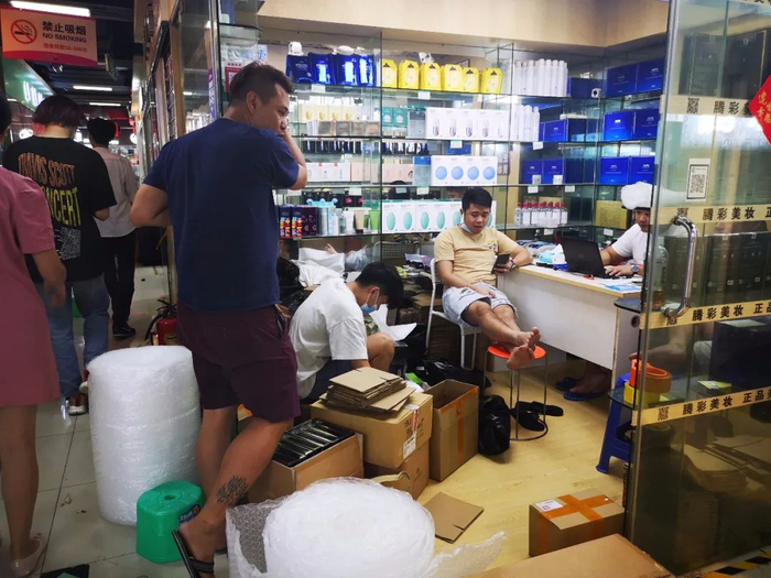这样的场景,在明通东西南北四个门口时有发生。走进化妆品市场,你会发现里面人更多更拥挤。从下午到晚上,夜越深,这里的人流量反而越大,晚上九、十点仍挤得像节假日的景点一样,直到深夜一两点才消停。
