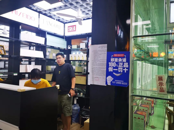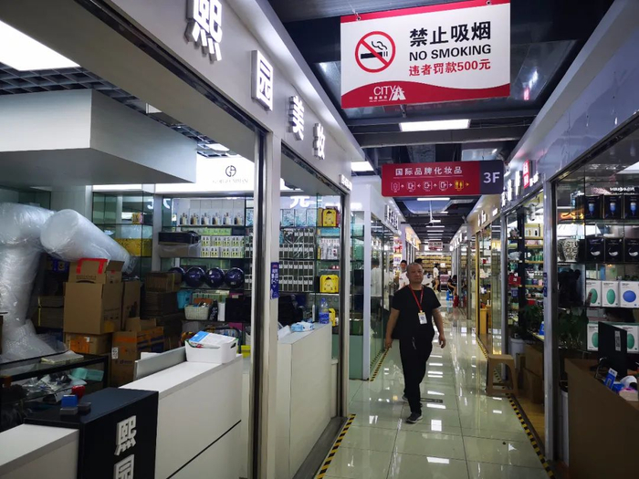 21世纪经济报道记者了解到,明通化妆品市场目前分A、B两栋楼,A座是老数码城,B座是桑达大厦,原先也是做数码电子类交易,今年才改造成为美妆城,6月份刚刚对外营业。两栋楼的美妆店铺目前有2500家,百分之八九十已经招租出去,尤其是A座,几乎已无店铺,火爆异常。