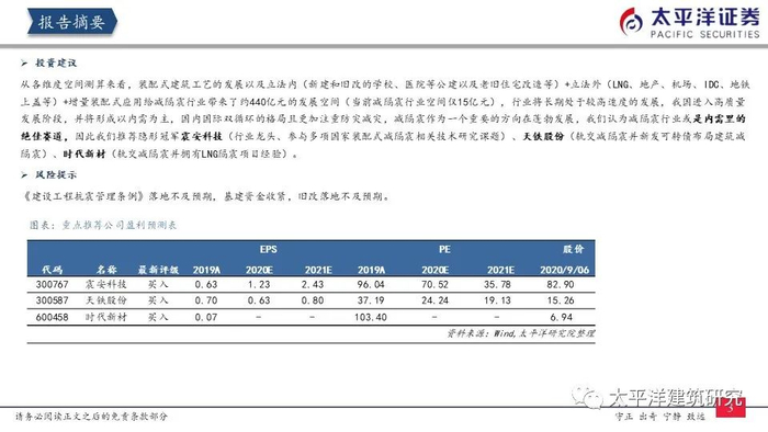 从各维度空间测算来看,装配式建筑工艺的发展以及立法内(新建和旧改的学校、医院等公建以及老旧住宅改造等)+立法外(LNG、地产、机场、IDC、地铁上盖等)+增量装配式应用给减隔震行业带来了约440亿元的发展空间(当前减隔震行业空间仅15亿元),行业将长期处于较高速度的发展,我国进入高质量发展阶段,并将形成以内需为主,国内国际双循环的格局且更加注重防灾减灾,减隔震作为一个重要的方向在蓬勃发展,我们认为减隔震行业或是内需里的绝佳赛道,因此我们推荐隐形冠军震安科技(行业龙头、参与多项国家装配式减隔震相关技术研究课题)、天铁股份(轨交减隔震并新发可转债布局建筑减隔震)、时代新材(轨交减隔震并拥有LNG隔震项目经验)。