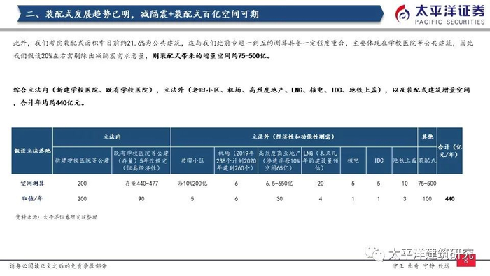 综合立法内(新建学校医院、既有学校医院),立法外(老旧小区、机场、高烈度地产、LNG、核电、IDC、地铁上盖),以及装配式建筑增量空间,合计年均约440亿元。