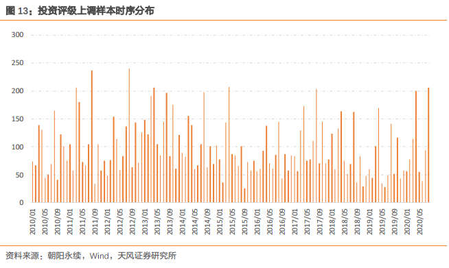 有效评级调整。按照如下标准筛选 2010 年以来的投资评级上调样本:
